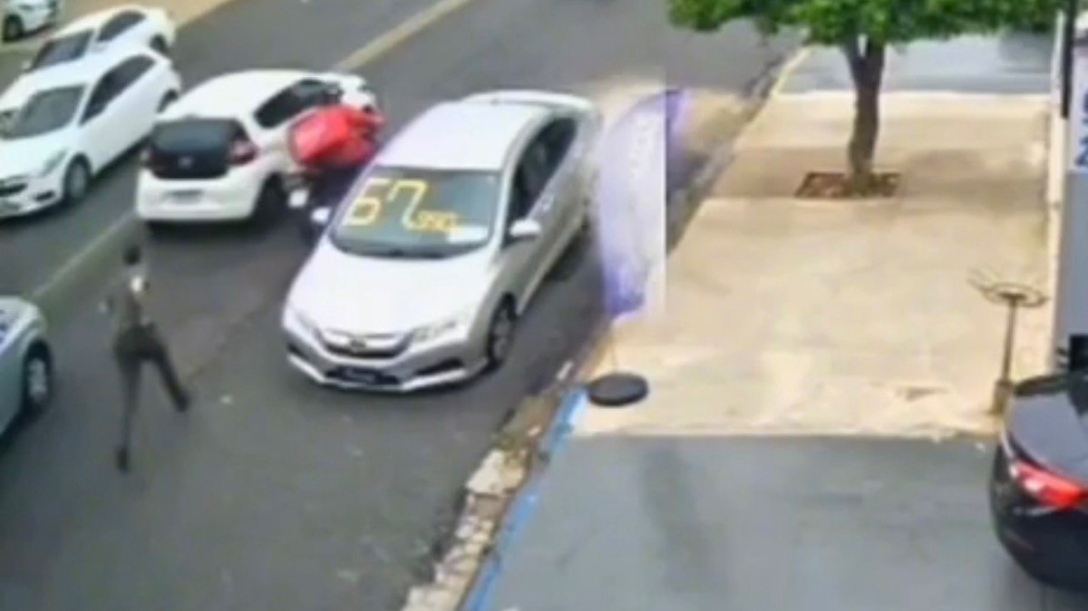 Imagens de câmeras de segurança mostram o suspeito, em uma moto, circulando em torno de um Fiat Mobi branco, tentando bloquear a passagem do veículo e abrir a porta. Segundo a Guarda Municipal, ele chegou a atirar contra o pneu traseiro do carro.